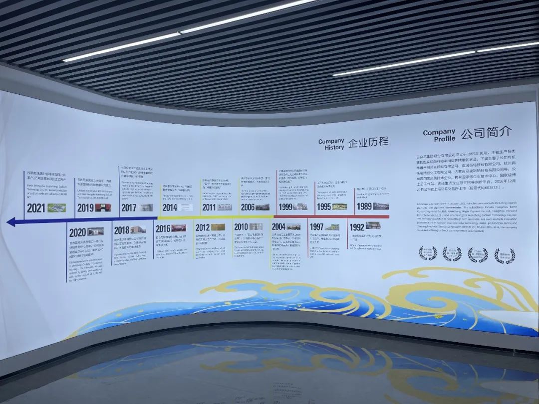 In the center of the exhibition hall, the product and application physical display area shows some products and application fields produced by the company, and the lily pattern on the background wall is also echoed by the lily Group. The product display area places various specifications of lily pigment products, which allows visitors to feel the quality of pigments at zero distance. The product application area shows the wide application of lily pigments in ink, coatings, plastics, leather, cosmetics, liquid crystal electronics and other special fields. In the field of ink, the company provides corresponding products for the coloring and anti-counterfeiting of RMB. In the field of coatings, the company's products are suitable for all kinds of high-end automotive paint and other coating products. Among them, the company earned the first bucket of gold in the main color of the construction of Nanpu Bridge, which laid a certain foundation for the rapid development of the company in the future. In the field of plastics, the company provides environmentally friendly pigments with low aromatic amines and no heavy metals, which solves the safety and environmental protection problems in plastic applications. In other special areas, we can see the application of sparkling pearlescent pigments in the field of cosmetics.